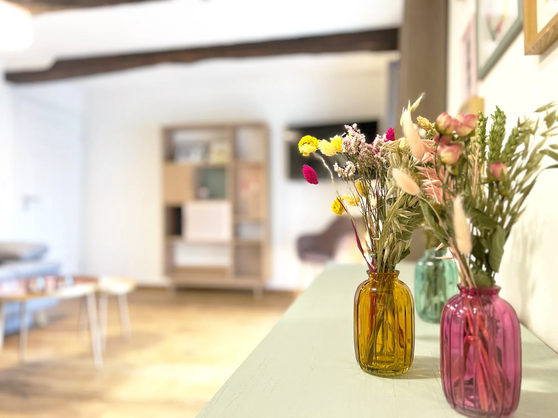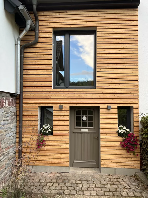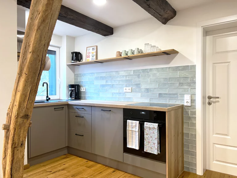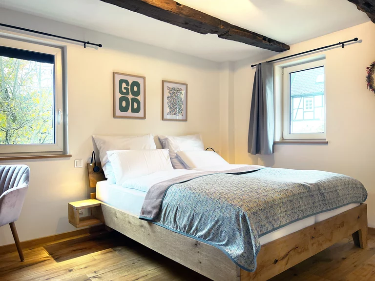 Das über 200 Jahre alte Fachwerkhaus wurde von uns mit viel Liebe und Handarbeit mit nachhaltigen Baustoffen vollständig renoviert. Die alten Eichenbalken wurden freigelegt und der verbaute Lehm wieder eingebaut. Die Wandheizung mit Lehmputz schafft wohlige Wärme und sorgt für ein ganz besonderes Raumklima.